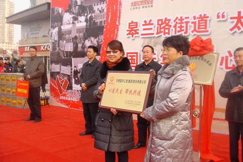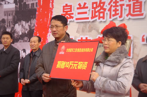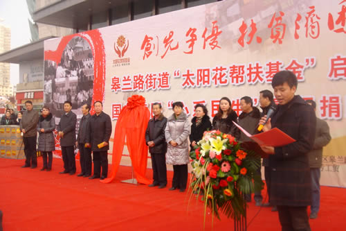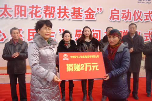 2012元月6日下午3時,甘肅國芳集團(tuán)聯(lián)合城關(guān)區(qū)皋蘭路街道黨工委、辦事處舉行了“創(chuàng)先爭優(yōu)、扶貧濟(jì)困”太陽花幫扶基金啟動儀式,充分體現(xiàn)民生為本的服務(wù)宗旨,著力搭建社會幫扶救助平臺,切實解決弱勢群體實際困難,促進(jìn)和諧街道建設(shè)。