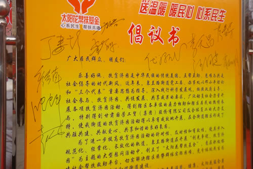 與會領(lǐng)導(dǎo)分別在太陽花幫扶基金倡議書簽名,倡議大家都能有樹立助人為樂、助人為榮的觀念