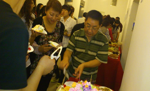 15、職能部門冷餐會,大家分享著美味的蛋糕和甜點(diǎn)。