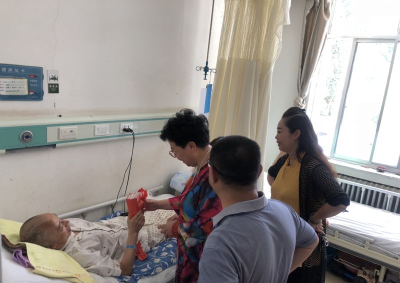 “這是公司的一點心意,希望能幫助你們度過難關(guān)…”6月28日下午,甘肅國芳工貿(mào)(集團)股份有限公司董事會董事、財務(wù)總監(jiān)兼工會主席,人力資源總監(jiān)以及黨委常務(wù)副書記一行人驅(qū)車趕往蘭州大學(xué)第一醫(yī)院東崗院區(qū),慰問公司患病職工閆世忠,并代表公司送上愛心捐款50000元,令閆世忠及其家人備受感動和鼓舞。